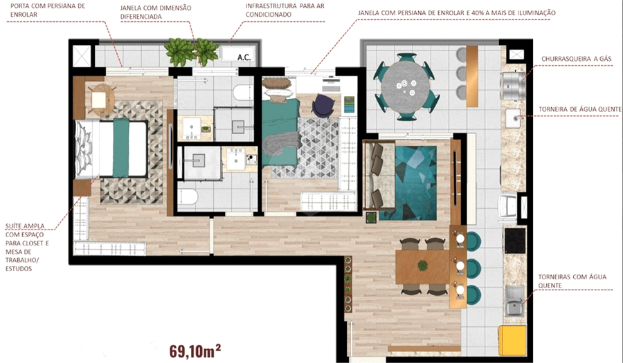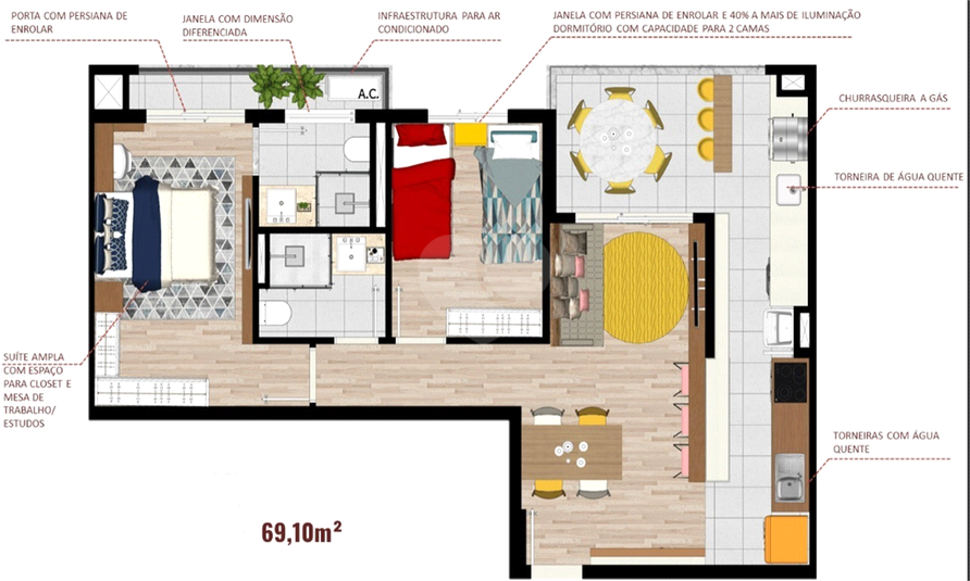 O imóvel conta com 2 dormitórios, sendo 1 suíte, sala ampla para dois ambientes com sacada integrada, cozinha em conceito aberto, área de serviço e 1 banheiro social. Possui ainda 1 vaga de garagem.